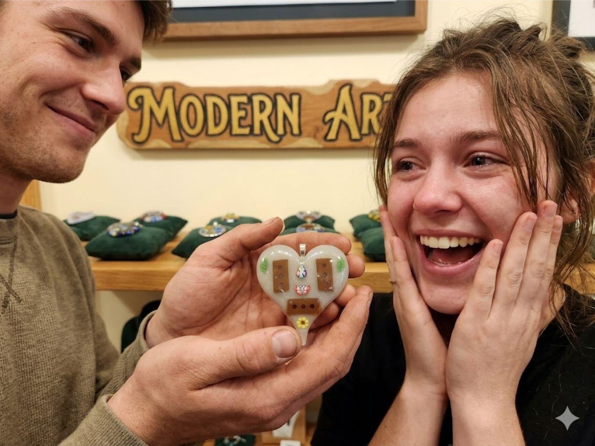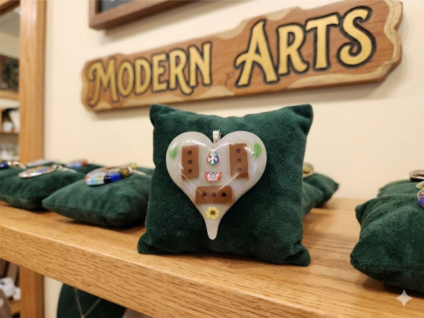 This is a pretty and unique jewelry heart shape. It is handmade by Modern Arts! We used a chameleon powder in the resin and mixed three colors and created a swirled design in the heart. The chameleon powder has color changing properties so when light hits the surface you'll see different colors. The pendant comes with 16" leather rope.